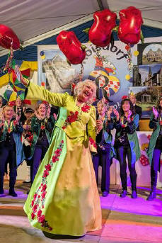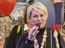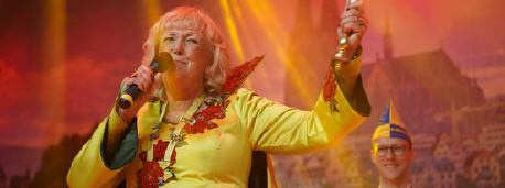 Christa I. (Mertgen), als Tochter eines Funkenmariechens für ihr Amt präsdestiniert, verspricht gemeinsam mit den Musikfreunden Roisdorf dem närrischen Volk: "Mit jecken Tönen wollen wir Euch verwöhnen!"