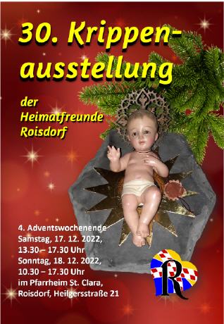Es ist dies die 30. Krippenausstellung der Roisdorfer Heimatfreunde in Folge. Geboten werden wiederum vielfältige und wunderschöne Krippendarstellungen, die örtliche Krippenfreunde und solche aus der Region zur Verfügung gestellt haben. Die Besucher können sich in eine wohlige vorweihnachtliche Stimmung versetzen lassen, dies natürlich auch wieder in einer Cafeteria mit Kuchen, Kaffee und dem speziellen weißen Glühwein der Heimatfreunde.