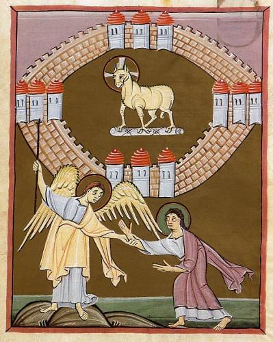 Die Stadt hat eine große und hohe Mauer mit zwölf Toren und zwölf Engeln darauf. Auf die Tore sind Namen geschrieben: die Namen der zwölf Stämme der Söhne Israels. Im Osten hat die Stadt drei Tore und im Norden drei Tore und im Süden drei Tore und im Westen drei Tore. Die Mauer der Stadt hat zwölf Grundsteine; auf ihnen stehen die zwölf Namen der zwölf Apostel des Lammes. …“