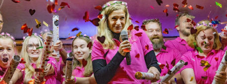 Christa I. (Mertgen), als Tochter eines Funkenmariechens für ihr Amt präsdestiniert, verspricht gemeinsam mit den Musikfreunden Roisdorf dem närrischen Volk: "Mit jecken Tönen wollen wir Euch verwöhnen!"