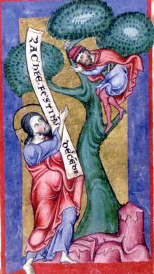 Er gibt sich damit als die Verkörperung des kleinwüchsigen Oberzöllners Zachäus aus Jericho zu erkennen. Dieser war gemäß dem Lukasevangelium (Luk 19, 1 – 10) auf einen wilden Maulbeerfeigenbaum geklettert, um den vorbeiziehenden Jesus besser sehen zu können. Jesus machte jedoch halt und forderte ihn auf, eilends von dem Baum herunterzusteigen, da er, der Verachtung der ehrbaren Bürger zum Trotz, beabsichtigte, bei ihm einzukehren. Dieses Evangelium wurde seit dem Mittelalter bei jeder Kirchweihe und beim Hochamt eines jeden Kirchweihfestes verlesen und war so den Menschen vertraut. Bereits für das 16. Jahrhundert ist belegt, dass man die Kirmesfahne, die am Kirmesbaum befestigt war, als das Gewand des Zachäus deutete, das ihm beim Hinunterklettern hängen geblieben war. Noch heute setzt man mancherorts, dem Bericht des Evangelisten entsprechend, den Zacheies in den festlich geschmückten Kirmesbaum.
