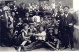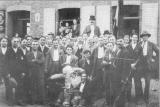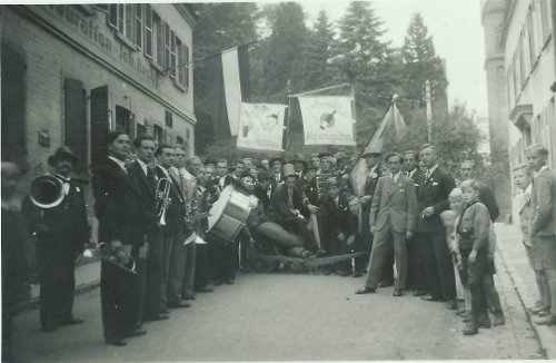 Theaterverein "Alpenglühn" mit Paias auf Schörreskarre (von der Pauke halb verdeckt) vor der Wirtschaft Rech ("Zur Wolfsburg")