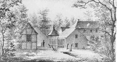 Ein Walmdach wies einst auch das nördliche Gegenstück zum Scheunenbau auf, ein Gesindehaus, das heute fehlt, so dass die ursprüngliche Symmetrie der Anlage leider empfindlich gestört wird. Es handelte sich hierbei um ein stattliches Fachwerkgebäude, das indes etwas geringer dimensioniert war als der Scheunenbau. Da es in den benachbarten Teich zu rutschen drohte, wurde es 1837 abgetragen. Hierzu unten mehr.