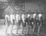„Frisch – fromm – fröhlich – frei“ lautete der Wahlspruch der Turnerbewegung, die in der Zeit nach dem Ersten Weltkrieg auch in Roisdorf begeisterte Anhänger fand. Stolz präsentiert sich hier die Riege des Roisdorfer Turnvereins im als Turnhalle genutzten Saal des Wohlfahrtshauses in der Siegesstraße, einem ehemaligen Tanzsaal. Vier der abgebildeten Recken waren Brüder: Fritz, Hein, Toni und Josef Faßbender vom Lindenberg. Wenig später sollte der Roisdorfer Turnverein aufgrund des Verbots der kirchlichen Jugendarbeit durch Nationalsozialisten sein vorläufiges Ende finden.