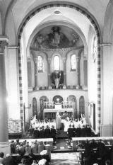 Der österlich geschmückte Chor der alten Pfarrkirche bot stets einen besonders festlichen Rahmen für die Feier der Erstkommunion in Roisdorf. Unser Bild zeigt eine von Pastor Matthias Ossenbrink geleitete Sakramentsandacht am Nachmittag des Weißen Sonntags. Auf unserem Bild zudem gut zu erkennen die traditionelle Sitzordnung der alten Pfarrkirche mit Frauenseite und Männerseite, wobei auf letzterer auch die Roisdorfer Ordensschwestern ihren Platz hatten und sich auch bereits einige mutige Frauen dort befanden. Niemals jedoch hätte sich ein Mann auf die Frauenseite gesetzt.