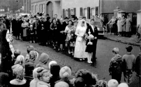 Bis in die 1970er Jahre hinein war es ein schöner Brauch, dass ein Brautpaar mit seinen Hochzeitsgästen in einem Festzug zur Kirche und von dort zur Feier zuhause oder in der Gastwirtschaft zog – natürlich zu Fuß und nicht wie heute üblich in Form einer hupenden Autokarawane. Das ganze Dorf konnte so an dem festlichen Ereignis teilhaben, und auch die Kinder des Kindergartens, unweit der Pfarrkirche gelegen, bezeugten dem Brautpaar stets ihre Referenz. Erst wenn die Hochzeitsgesellschaft, die mit in Verse gefassten Worten zu einer Spende aufgefordert wurden, etwas in die bereitgehaltenen Körbchen der Kinder gegeben hatte, konnte der Hochzeitszug fortgesetzt werden. Unser Bild zeigt die Hochzeit von Gottfried Breuer und Renate Giesen im Jahre 1963.