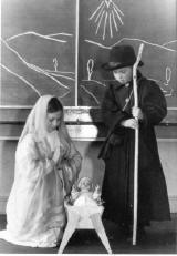 Auf die Feste und Feiern des Kirchenjahres wurden die Kinder in der Roisdorfer Volksschule von ihren Lehrern und Lehrerinnen stets intensiv vorbereitet. So verfügte manche Klasse gegen Ende der 1940er Jahre über eine eigene Adventskrippe. Die besonders braven und fleißigen Kinder bekamen als Belohnung einen Strohhalm, den sie in die Krippe legen durften. Wer dann zu Weihnachten die meisten Strohhalme vorzuweisen hatte, durfte dann auch das Jesuskind hineinlegen. Beliebt war es, kurz vor dem Fest ein kleines Krippenspiel aufzuführen, bei dem es für jedes der Kinder natürlich eine besondere Auszeichnung bedeutete, wenn es die Rolle der hl. Maria oder des hl. Josef übernehmen durfte. Unser Dezemberbild zeigt Margret Gratzfeld und Gretel Balg, denen diese Ehre zuteil wurde.