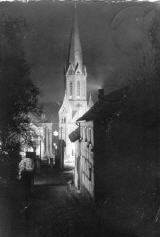 An Pastor Matthias Ossenbrink, der die Pfingstferien in Flüeli in der Schweiz verbrachte, sandte im Jahre 1954 Lehrer Josef Görtz die herzlichen Grüße des Roisdorfer Schulkollegiums. Es ist durchaus anzunehmen, dass Görtz selbst die fotografische Vorlage für die hierzu verwendete Ansichtskarte angefertigt hatte, war er doch ein begabter und leidenschaftlicher Hobbyfotograf, der das Leben in Roisdorf über Jahrzehnte hinweg dokumentierte. Mit dem abendlichen Blick vom Lindenberg auf die von Straßenlaternen beleuchtete Roisdorfer Pfarrkirche St. Sebastian war ihm eine besonders stimmungsvolle Aufnahme gelungen.