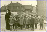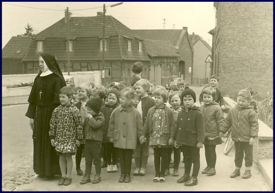 Gewiss werden sich die heute in gereifterem Alter befindlichen Jungen und Mädchen gerne an ihre Kindergartenzeit mit der beliebten, weil im Vergleich zur gestrengen Schwester Hermelanda herzlich wirkenden Schwester Assunta als Erzieherin erinnern. Was unser vor dem inzwischen abgebrochenen Kindergarten in der Siegesstraße aufgenommenes Bild indes besonders macht, ist das im Hintergrund befindliche Gebäude, der Hof der Familie Rech, besser bekannt als „Müschers Haus“. Was wir hier noch samt der später abgebrochenen Scheune aus Ziegeln und dem weinberankten Torbau sehen, war bekanntlich einstmals das barocke Kontorhaus des Mineralbrunnens auf dessen Gelände in der Brunnenstraße. Im Jahre 1860 war es durch einen Brand beschädigt worden, so dass man sich am Brunnen zu einem modernen Neubau entschloss. Landwirt Schmidt (Beiname Müscher) kaufte kurzerhand das alte, aber noch stabile Fachwerkhaus, zerlegte es, baute es in der „Hött“ (Siegesstraße) wieder auf und ergänzte es zu einem stattlichen bäuerlichen Gehöft. Noch heute kann man brandgeschwärzte Balken an dem Gebäude erkennen, das zwar Denkmalschutz genießt, doch seit Jahren leer steht und damit letztlich dem Verfall preisgegeben ist. Hier sind Ideen und Initiativen dringend vonnöten, soll ein wertvolles Zeugnis der Roisdorfer Vergangenheit nicht für immer verloren gehen.