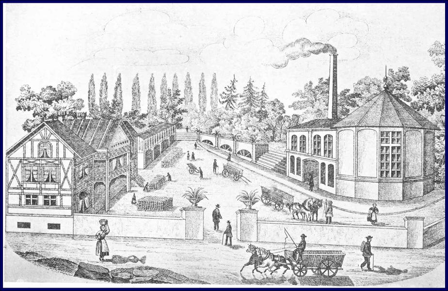 Als der Kölner Apotheker und Mineralwasserhändler Wilhelm Custor 1876 den Roisdorfer Brunnen vom Alfterer Fürsten zu Salm-Reifferscheidt pachtete, hielt moderne Technik Einzug in den damals recht vernachlässigt wirkenden Betrieb. Anstelle gescheiterter Bemühungen, den Brunnen zum Zentrum eines Kurortes zu machen, setzte man nun auf die industrielle Förderung des Mineralwassers und einen durchorganisierten Vertrieb. In unserem Bild, das Custor für eine Werbeschrift dieser Zeit verwendete, verweist ein rauchender Schlot an dem Gebäude über der Quelle auf den Einsatz neuer, mit Dampf betriebener Abfüllanlagen. „Nach und nach zeigte sich der Erfolg dieser Arbeit“, resümierte Custor später zum 25-jährigen Betriebsjubiläum im Jahre 1901: „Das Geschäft hob sich von Jahr zu Jahr und festigte sich immer mehr. Ein Neubau nach dem anderen musste errichtet werden, um die nötigen Räume für die stets sich mehrende Zahl der Arbeiter zu schaffen und den wachsenden Anforderungen des Geschäfts zu genügen.“