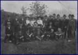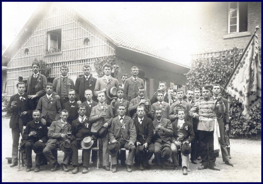 Aufzeichnungen über den Roisdorfer Junggesellenverein bzw. die hiesigen Junggesellenvereine vor dem 20. Jahrhundert – ein erster Beleg stammt aus den 1790er Jahren – haben sich leider nicht erhalten. Das hier vorliegende Bild dürfte damit das älteste fotografische Zeugnis für einen solchen Verein darstellen. Zwar ist es nicht datiert, doch erlaubt ein Vergleich mit dem bekannten, an exakt derselben Stelle, nämlich vor der Remise bzw. dem sog. „Eishaus“ von Haus Wittgenstein aufgenommenen Foto der Teilnehmer der letzten Weinlese des Jahres 1901, unser Bild als um diese Zeit angefertigt zu bestimmen. Offenbar hatten die Junggesellen, die sich dort mit ihrem Fähnrich im Sonntagsstaat und mit dem Bierglas in der Hand präsentieren, samt Kornkapelle einen Zug durch den Ort unternommen, wie dies in ähnlicher Weise auch heute beim Maifest bzw. an den Kirmestagen üblich ist. Vielleicht kann jemand noch den einen oder anderen der Abgebildeten als seinen Vorfahren identifizieren.