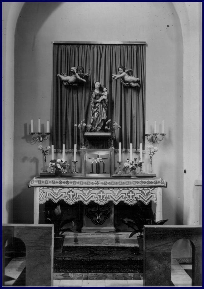 In den 1950er Jahren empfand man den Marienaltar der Pfarrkirche St. Sebastian nicht mehr als zeitgemäß. Die reich verzierten neuromanischen Altaraufbauten und die große Marienfigur aus Stuck mussten daher weichen. Nach der Neugestaltung präsentierte sich der Marienaltar wesentlich schlichter, doch auch weit kostbarer: Über der Altarmensa war nun ein blauer Samtvorhang angebracht. Auf einer Konsole, einer – wohl aus dem Heiligenhäuschen des ehemaligen Siechenhauses stammenden – Altarplatte, befand sich nun, von zwei barocken, im Maßstab nicht unbedingt passenden Engelchen umschwebt, die uralte Figur der Madonna mit Kind. Diese hatte bereits zur Ausstattung der ersten Roisdorfer Kapelle von 1773 gehört: Es handelte bzw. handelt sich bei ihr um die vorzügliche Arbeit einer Kölner Werkstatt der Zeit um 1500. Der Bildhauer hat es verstanden, in der Darstellung der Gottesmutter die Merkmale der makellosen Jungfrau, der Himmelskönigin, der „neuen Eva“ und der „apokalyptischen Frau“ harmonisch miteinander zu vereinen. Die Geste der Berührung des Fußes des Kindes und dessen Nacktheit betonen den Leib Christi, verleihen damit der Darstellung, für uns heute nur noch schwer lesbar, einen ausgeprägt eucharistischen Charakter. Nur etwa 15 Jahre, bis zur Aufgabe der alten Pfarrkirche 1969, sollte der neu gestaltete Marienaltar Bestand haben. Selbstverständlich wurde die spätgotische Marienfigur später in die neue Pfarrkirche St. Sebastian übernommen, wo sie auch heute zum betrachtenden Gebet einlädt.