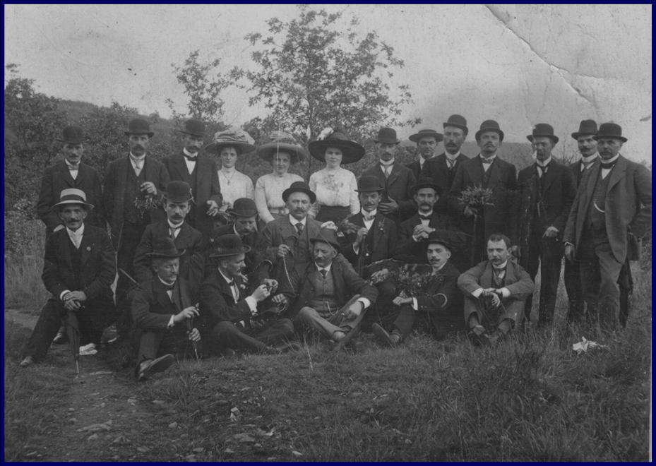 Im Jahre 1890 taten sich acht sangeskräftige Roisdorfer Männer und Jünglinge unter der Leitung des Lehrers Johann Heister – wir sehen ihn ganz rechts auf unserem Bild – zum Kirchenchor zusammen. Als dann im Herbst 1891 Roisdorf zur eigenständigen Pfarrei erhoben wurde, konnte der „Gesang-Verein Cäcilia“, dem sich inzwischen weitere Mitglieder angeschlossen hatten, die Festlichkeiten bereits durch seine Gesänge verschönern. Mehrstimmige Messen kamen fortan an besonderen Fest- und Feiertagen zur Aufführung, etwa beim jährlichen Kirmesfest. Selbstverständlich beteiligte man sich auch an besonderen weltlichen Anlässen im Ort (Vereins- und Betriebsjubiläen, Kaisers Geburtstag). Wichtig war darüber hinaus – wie dies auch heute noch gilt – die im Verein gepflegte Geselligkeit: Seit der Gründungszeit unternahm man gemeinsame Ausflüge, gern an Rhein und Ahr, an denen auch Damen, denen die aktive Mitwirkung im Chor bis in die 1940er Jahre hinein verwehrt sein sollte, teilnehmen konnten. Noch nach Jahrzehnten erinnerten sich die frühen Chormitglieder schmunzelnd an diese Ausflüge, die offenbar in aller Regel recht feucht-fröhlich und ausgelassenen endeten – wovon auf unserem Bild der Zeit um 1910 allerdings nichts zu bemerken ist.