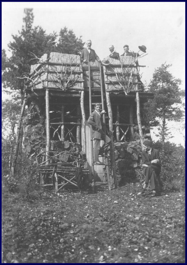 Aus dem Ort Winterstettenstadt bei Biberach an der Riß hatte es den Kunst- und Handelsgärtner Anton Maucher an den Rhein verschlagen. In Alfter kaufte er landwirtschaftliches Gelände nebst Haus mit Garten und heiratete er ein einheimische Mädchen. Experimentierfreudig, wie er war, ging er daran, den Niederwald auf den Vorgebirgshöhen zu roden, um dort Erdbeerkulturen anzulegen. Da diese allerdings nur in den ersten Jahren gut gediehen, kam er auf die Idee, sie durch Kulturen von Brombeeren zu ersetzen, die hinsichtlich des Bodens geringere Ansprüche stellten. Auf der höchsten Stelle des Geländes, von wo aus man seit jeher einen unvergleichlichen Blick auf die heimatliche rheinische Landschaft genießen konnte, errichtete er aus den Stämmen und Wurzelstöcken der abgeholzten Bäume einen Turm, dessen unterer Teil eine kunstvoll gestaltete Laube bildete, während man zum oberen, als Aussichtsplateau genutzten Teil über eine Leiter gelangen konnte. Unser Bild aus der Mitte der 1920er Jahre zeigt Anton Maucher u.a. mit seinem Sohn Theo sowie dem Sohn Wilhelm, dessen legendärer Brombeerwein „Rebellenblut“ später die Attraktion des an der selben Stelle befindlichen, heute leider geschlossenen Ausflugslokals „Heimatblick“ bilden sollte.