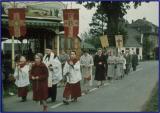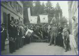 Eine „Männerreih“ zu bilden, war in der Zeit vor dem Zweiten Weltkrieg eine beliebte Form, die Roisdorfer Kirmes zu begehen. Von Gastwirtschaft zu Gastwirtschaft – und davon gab es in Roisdorf damals bis zu acht – zog man am Kirmesmontag in feucht-fröhlicher Runde durch den Ort, nicht selten und Mitnahme des Kirmespaias. Für den mit unserem Bild dokumentierten Zug hatte der Mandolinen-Club als „Verein Alpenglühn“ – mit Weinflasche in der Standarte – einen befreundeten Verein eingeladen, den wohl nur für solche Gelegenheiten gegründeten „Arbeitslosen-Gesangverein Köln-Nippes“, der gleichfalls eine Standarte mitführte. Der Fähnrich des Roisdorfer Junggesellenvereins und die Musiker der „Kapelle Heister“ begleiteten den Zug. Auf einer Schörreskarre führte man den Paias mit, wobei auch einige der mit Frack und Zylinder verkleideten Zugteilnehmer sich bisweilen auf der Karre mitschieben ließen. Zu einem repräsentativen Abschlussbild versammelte man sich vor der Gastwirt-schaft von Johann Rech am Ausgang der Brunnenstraße, wobei der Paias in der Mitte, mit seiner Maske ohnehin kaum von den Beteiligten zu unterscheiden, von der großen Pauke leider halb überdeckt wird.