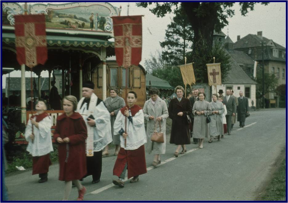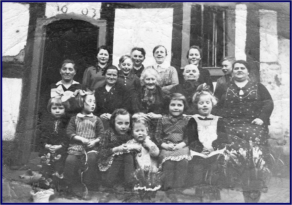 Wenn Großtante Constanze, gut situierte Ingenieurswitwe aus Remscheid, vielleicht anlässlich eines Namenstags oder runden Geburtstags, bei ihren Roisdorfer Verwandten auf dem Vendelshof zu Besuch kam, so war dies auf jeden Fall ein guter Grund dafür, sich samt Kind und Kegel sowie Nachbarschaft zwecks Aufnahme eines Gruppenbildes um sie zu versammeln. Das Bild, bei dem man die typischen Festtags-Präsente in Form mit gedrehtem Krepppapier umwickelter Blumentöpfe vor der Gruppe postierte, ist nicht nur ein Dokument für eine ländliche Roisdorfer Festgesellschaft der 1930er Jahre, sondern nicht zuletzt auch für den Ort, an dem es aufgenommen wurde: den Innenhof des Gehöfts der Familie Vendel, also des traditionsreichen Dietkirchener Hofes, den man bekanntlich in den 1990er Jahren nach seinem Einsturz abbrechen sollte und von dem heute lediglich die auf unseren Bild über der Eingangstür zu erkennende Eichenplatte mit der eingeschnitzten Jahreszahl 1603 zeugt.