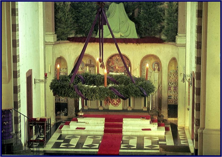Fast übergroß hängt er noch heute über dem Altar der Pfarrkirche St. Sebastian, der aus Tannenzweigen gebundene, mit Kerzen und Bändern verzierte Roisdorfer Adventskranz. Sowohl die Größe als auch die Platzierung des Kranzes, in der Umgebung einmalig, weisen auf seine besondere Symbolik hin. Wie einst die großen Radleuchter der früh- und hochmittelalterlichen Kirchen – eindrucksvoll heute noch in Hildesheim, aber auch im Aachener Dom zu sehen – ist er das Sinnbild der apokalyptischen Gottesstadt, wie sie gemäß der Offenbarung des Johannes, des letzten Buches des Neuen Testamentes am Ende der Zeiten vom Himmel herabkommen wird. Die Ankunft (lateinisch „adventus“) des Reiches Gottes, sie ist es, die letztlich in der Bußzeit vor Weihnachten, also der Adventszeit, herbeigesehnt wird. Die Symbolik, wie sie bereits bei den ersten Adventskränzen des 19. Jahrhunderts bewusst aufgenommen wurde, erscheint heute bei den vielfältigen und aufwändigen Adventsdekorationen fast gänzlich ausgeblendet. Es ist schön, dass unser Adventskranz, den wir hier noch in der Apsis der alten Pfarrkirche sehen, den ersehnten Advent des Reiches Gottes immer noch in solch reiner und anschaulicher Weise vermittelt.