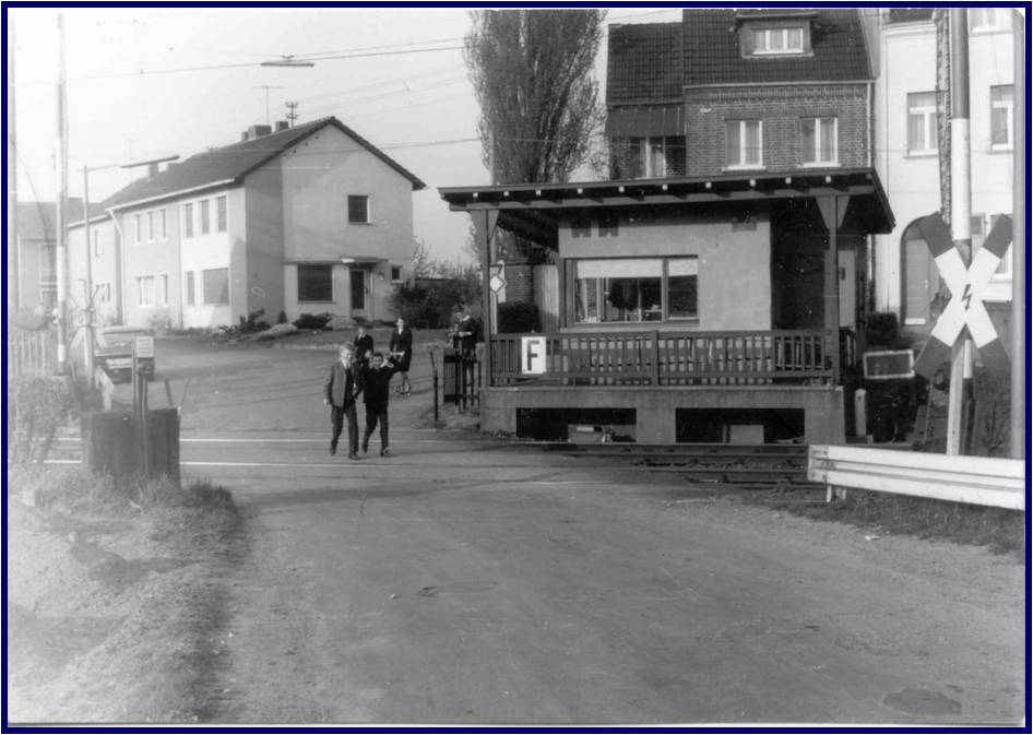Manche Dinge verschwinden aus den Ortsbild, ohne dass man es so recht bemerkt. Erst, wenn man unversehens ein Foto davon sieht, erinnert man sich an die in früheren Zeiten vertraute Gegebenheit. Als Beispiel hierfür kann die Fotografie dienen, die wohl bei dem Sonntagsspaziergang einer Roisdorfer Familie in den 1960er Jahren aufgenommen wurde, und die gewiss nicht dazu gedacht war, die verkehrstechnischen Verhältnisse Roisdorfs in dieser Zeit zu dokumentieren. Sie zeigt den Bahnübergang im Maarpfad, an der Einmündung der Custorstraße, der in den 1990er Jahren geschlossen und durch eine Unterführung für Fußgänger und Radfahrer ersetzt werden sollte. In dem dortigen Häuschen hatte ein Bahnwärter darauf zu achten, dass die Schranken stets rechtzeitig mit der Handkurbel geschlossen und wieder aufgemacht wurden – welch ein Umstand, aber auch welch ein Luxus, denkt man sich heute in einer Zeit, in der dergleichen an verbliebenen Bahnübergängen elektro-nisch gesteuert zu geschehen pflegt.