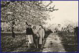 Anstelle des nicht mehr lukrativen Weinbaus hatten sich seit der Mitte des 19. Jahrhunderts die Kirsch-, Apfel-, Birnen-, Pflaumen- oder Pfirsich-bäume auf den Hängen der fruchtbaren Landschaft ausgebreitet. Lange Jahrzehnte galt das dicht mit Obstbäumen bestandene Vorgebirge zur Zeit der Baumblüte im Frühjahr als beliebtes Ausflugsziel erholungs-suchender Städter aus Köln oder Bonn, wovon nicht wenige Gastwirtschaften, nicht zuletzt in Roisdorf, profitierten. Aber auch die einhei-mische Bevölkerung wusste die Obstgärten ringsum und sogar mitten im Ort zu schätzen, boten sie sich doch für ausgedehnte sonntägliche Spaziergänge an. Natürlich lustwandelte man in dem Blütenmeer nicht, wie dergleichen heute geschieht, in Freizeitkleidung, sondern in dem Tag des Herrn angemessener Kleidung, wie bei den abgebildeten jungen Damen, in Kostüm, Sonntagsmantel und mit Handtasche. Vielleicht fand der Spaziergang seinen Abschluss bei Kaffee, Kuchen oder gar einem Gläschen Rebellenblut im über dem Ort inmitten von Obstgärten und Brombeerfeldern gelegenen Heimatblick, der heute, ebenso wie die aus-gedehnten Obstgärten, die längst der Bebauung, Pferdeweiden oder anderem zum Opfer gefallen sind, der Vergangenheit angehört.