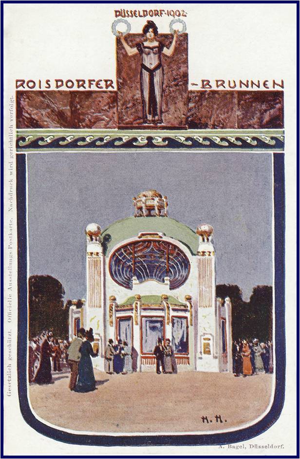 Eigens kam der Kronprinz aus Berlin, um im Jahre 1902 als Ehrenvorsitzender die große Düsseldorfer Industrie- und Gewerbeausstellung der preußischen Rheinprovinz, die gleichwohl den Pariser Weltausstellungen kaum nachstand, zu eröffnen. Etwa 2.300 Aussteller führten in 128 Gebäuden und auf Freiflächen von ca. 530.000 qm die Erzeugnisse der „rheinisch-westfälischen Weltindustrie“ vor, unter ihnen natürlich auch der Roisdorfer Mineralbrunnen, der im Jahr zuvor das 25. Jubiläum des Pächters Wilhelm Custor gefeiert hatte. Custor hattr alle Kurorträume aufgegeben, um den Brunnenbetrieb mit Hilfe zeitgemäßer industrieller Verfahren und geschickter Vermarktungsstrategien wieder konkurrenzfähig zu machen. Unser Bild zeigt den repräsentativen Pavillon, den man in den aktuellen Formen des Jugendstils errichtete, um sich dem internationalen und verwöhnten Publikum als auf der Höhe der Zeit zu erweisen. Silberne Lobeerkränze, auf der offiziellen Postkarte von einer weiblichen Figur gehalten, verwiesen auf dem Wasser bereits auf anderen Gewerbeschauen verliehene hohe Auszeichnungen, die goldenen Kugeln am Pavillon auf die Weltgeltung, die das Produkt beanspruchen konnte.