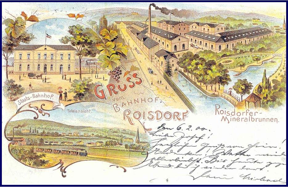 „Roisdorf, den 2.6.00. Lieber Josef! Herzlichste Grüße von hier! Andenken! Wetter wieder allerliebst! Bis heute Abend bin ich wieder dort! Dein Michael.“ Wir wissen nicht, wer dieser Michael war, der einen Tagesausflug ins Vorgebirge machte. Auf jeden Fall war er einer von den vielen Städtern, die mit der auf unserer Lithographie abgebildeten „Staatsbahn“ beim prächtigen ehemaligen Kurbahnhof ankamen, um den berühmten Mineralbrunnen zu besuchen und vielleicht, wie auf der Ansichtskarte zu sehen, eine Kahnfahrt auf dem Weiher des schön angelegten Brunnenparks zu unternehmen. Brunnenanlagen und Park sowie der Staatsbahnhof sind hier mit allen Einzelheiten wiedergegeben, das im Hintergrund der Bahnstrecke gelegene Dorf nur andeutungsweise. Immerhin sind im Oberdorf die Villa Anna und Haus Wittgenstein erkennbar, ebenso der neu erbaute Turm der Pfarrkirche. Nicht unterschlagen wurde die rauchspeiende große Fabrikanlage Gammersbach zwischen Bahnhof und Brunnen, obwohl sie den idyllischen Gesamteindruck gemindert haben dürfte.