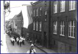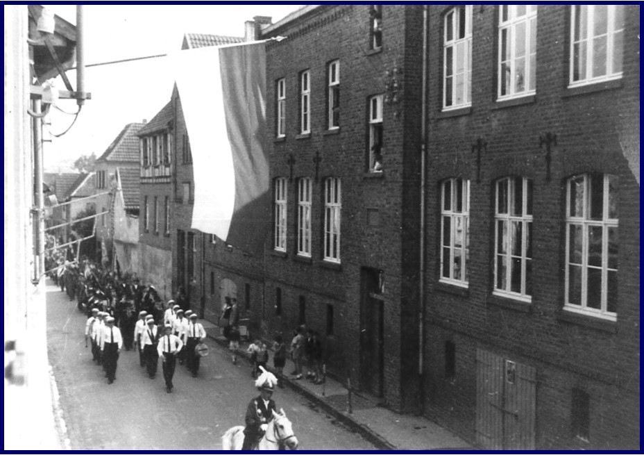 Hoch zu Ross führt Hauptmann Josef Vendel den Festzug der Roisdorfer St. Sebastianus-Schützenbruderschaft und weiterer Bruderschaften oder Vereine samt Fahnenabordnungen durch die Brunnenstraße an, dies wohl anlässlich des Königsschießens oder der Großkirmes. Dass die SebastianusSchützen bis heute vor den übrigen Ortsvereinen marschieren und ihre Fahnenabordnung als erste in die Kirche einzieht, hat nicht nur mit deren hohem Ansehen im Dorf zu tun, sondern vor allem mit der Gründung im Jahr 1848 bzw. damit, dass die Schützen der älteste bis heute bestehende Verein im Ort sind. Auf unserem Bild schön zu erkennen, lediglich durch die Schützenfahne am Haus bzw. der Bäckerei der Familie Romes teilweise verdeckt, die alte Volksschule, die wenige Jahre später zugunsten des Neubaus an der Friedrichstraße aufgegeben und 1968 abgerissen werden sollte. Inzwischen findet sich an der Stelle des mächtigen Schulgebäudes ein meist vollbesetzter Parkplatz, und auch die enge Straße selbst ist heute ohne dort parkende Autos undenkbar.