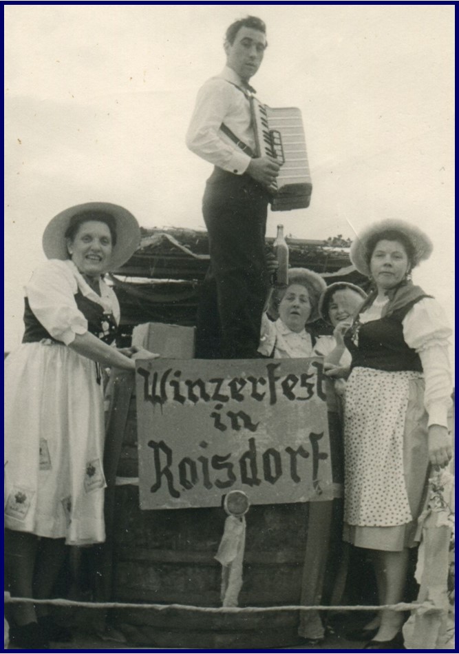 Von der altehrwürdigen Roisdorfer Weinbautradition wurde in diesem Kalender bereits des Öfteren berichtet, ebenso wurden bereits mehrere der Festwagen vorgestellt, mit denen in den frühen 1950er Jahren der damalige Heimatverein seine Erntedankfestumzüge gestaltete und die stets markante Szenen aus dem landwirtschaftlichen Bereich, oft zum Schmunzeln anregend, zum Thema hatten. Einer dieser Wagen nun war „Winzerfest in Roisdorf“ betitelt und als Winzerinnen verkleidete junge Frauen priesen, von einem Akkordeonspieler unterstützt, gut gelaunt die Qualität des Roisdorfer Weines, den es seit der Jahrhundertwende nicht mehr gab. Bemerkenswert ist, dass eine dieser Damen, Dorothea Klein besser bekannt als „Kleins Dorchen“, ihrem Sohn Ewald offenbar die Begeisterung für den Roisdorfer Wein vererbte: In den 1990er Jahren legte dieser auf dem Kripsberg über dem Roisdorfer Oberdorf einen Weingarten an, wo nun Regent- und Burgundertrauben wachsen, die zu einem mehr als trinkbaren Wein gekeltert werden. Neben diesem Weinberg besteht ein ebenso professionell betriebener Weinberg im Roisdorfer Hüsbroich. Hoch und noch lange lebe also die bereits totgeglaubte Roisdorfer Weinbautradition!