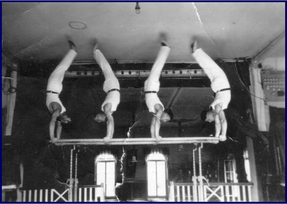 Die Zeit nach dem Ersten Weltkrieg und vor der Gleichschaltung durch die Nationalsozialisten in den 1930er Jahren war eine Blütezeit des Vereinswesens – in Deutschland allgemein und in unserem Heimatort nicht minder. Die Anfänge der bis heute lebendigen Ortsvereine TuS Roisdorf und Musikfreunde Roisdorf liegen in dieser Zeit. Groß war insbesondere die Vielfalt der Gruppen in kirchlicher oder weltlicher Trägerschaft, in denen sich die Jugendlichen engagieren konnten. Besonders beliebt bei der männlichen Jugend: Turn- und Sportvereine. Eine Turnhalle, wie sie heute bei der Sebastianusschule besteht, gab es natürlich noch nicht, doch eigneten sich für sportliche Übungen neben dem Saal des Wohlfahrtshauses in der Siegesstraße auch die Säle der Gastwirtschaften – immerhin gab es drei davon vor Ort – trefflich. Der Turnverein, den wir hier bei einer geradezu akrobatischen Übung am Barren sehen, tat dies im sog. „Drei-Kaiser-Saal“ der Gastwirtschaft Schlösser in der Brunnenstraße, dem später als Kino und dann als Diskothek „Weekend“ genutzten Saal der heutigen „Quelle“.