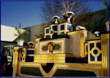 „Petersburger Schlittenfahrt“, „Mississippi Empress“, „Moulin Rouge“… die Karnevalswagen des TuSRoisdorf waren in den 1980er und frühen 1990er Jahren stets Höhepunkte des für seine ebenso phantasievoll wie aufwändig gestalteten Wagen berühmten Roisdorfer Weiberfastnachtszugs. Die aus versierten Handwerkern bestehende Wagenbautruppe des Fußballvereins lieferte sich dabei stets einen engagierten Wettbewerb z.B. mit der gleichfalls prachtvolle Prunkwagen produzierenden Truppe der KG Vorgebirgssterne, wobei man den Ehrgeiz hatte, den Wagen ohne ein einziges Papierröschen zu erstellen, was ein hohes Maß an Exaktheit und viel Detailarbeit erforderte. Von einem barocken Brunnen aus fast echtem Marmor und Gold grüßen auf unserem Bild Hans Kerz und Johannes Hartmann sowie dessen Sohn Dominik. Heute, nachdem auch „AltRoisdorf“ und „IGRK“ den Wagenbau aufgegeben haben, gibt es in Roisdorf nur noch andernorts gebaute, angemietete Prunkwagen. Vielleicht findet sich aber eines Tages wieder eine kreative und die Mühe nicht scheuende Truppe, die dem Roisdorfer Zug wieder den einstigen Glanz verleiht.