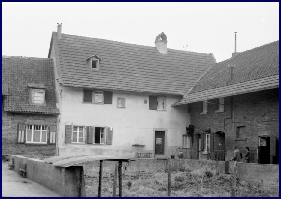 Der Clarenhof, über Jahrhunderte der größte Hof Roisdorfs, wurde bereits im Mittelalter erwähnt, und zwar im Jahre 1335, als ihn die mit den Herren von Alfter verwandte Familie von Metternich den Kölner Klarissen übertrug. Die jeweiligen „Cloarehalfe“, also die wechselnden Pächterfamilien, lieferten dem Kloster fortan vor allem Getreide und Gemüse. Wilhelm Jüssen sollte der letzte Pächter sein. Als das Kloster St. Clara wie alle rheinischen Klöster und Stifte im Jahre 1802 aufgelöst wurde, nutzte dieser die Chance und erwarb den Clarenhof. Jüssens Nachkommen bewirtschafteten den Hof bis zum Ende der 1960er Jahre, bevor das Gelände zum Zweck der Errichtung der neuen Pfarrkirche St. Sebastian an gleicher Stelle verkauft wurde. Erfolgte 1972 der Abriss des traditionsreichen Hofes, so starb dieser seinen zweiten Tod im Jahre 2009, als die umfangreich erhaltenen Dokumente aus Jahrhunderten seiner Geschichte zusammen mit dem Stadtarchiv vielleicht unwiederbringlich in den Kölner Untergrund sanken. Unser Bild gewährt einen Blick in das Innere des Hofes, auf das wohl aus dem 18. Jahrhundert stammende Wohnhaus und auf Stallungen des 19. Jahrhunderts samt davor gelegenem Misthaufen. Glücklicherweise blieb dieses seltene fotografische Dokument im stabiler fundamentierten Bornheimer Stadtarchiv erhalten.