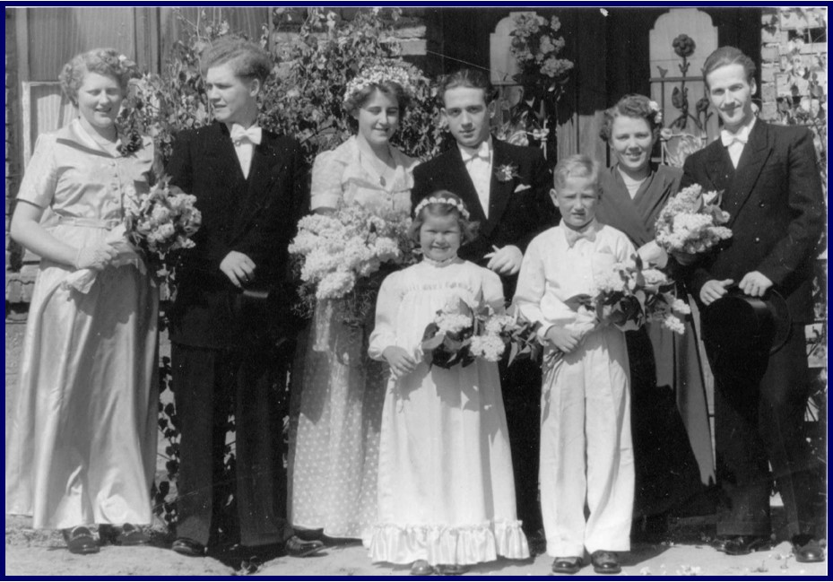 … aber ansonsten könnte das Bild auch aus der Gegenwart stammen: Festlich gekleidet zeigt sich das Maipaar, begleitet von zwei schmucken Ehrenpaaren. Beim Festzug durch das Dorf in offener Kutsche sowie bei den Maifesten der Umgebung wird die Truppe ihren Heimatort Roisdorf repräsentieren. Damals organisierte nicht ein Junggesellenverein, sondern der Heimatverein das Maifest. Willy Reuter von der Kolpingsfamilie ersteigerte bei der Mailehenversteigerung Käthe Bungartz, die er später, wie bei Maipaaren nicht selten, auch heiraten sollte. Aufgenommen wurde das Gruppenbild vor dem Elternhaus von Käthe Bungartz in der Weberstraße. Als Ehrenpaare fungierten Heinz Dahlen und Gertrud Botz, links neben dem Maipaar, und rechts von ihm Hans Vidua und die Schwester des Maikönigs Christine, die in den ersten Kolpingssitzungen als das Funkenmariechen fungierte, das die Redner in den Saal führte. Bei den Kindern handelte es sich um Gertrud Falkenbach und Willi Schneider. Es ist erfreulich, dass dieses traditionelle rheinische Brauchtum heute so lebendig ist wie eh und je.