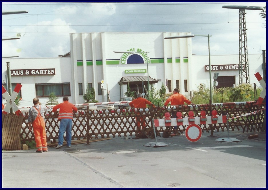 Schmuck sah sie damals noch aus – frisch weiß-bunt gestrichen –, die in den frühen 1930er Jahren im Art-deco-Stil gestaltete Fassade des Central-Markts. Aber nicht das war es, was die Aufmerksamkeit der Männer in ihren orangefarbigen Arbeitsanzügen auf sich zog. Sie warteten vielmehr auf die nächste Zugdurchfahrt an dem Bahnübergang der Güterbahnhofstraße, den sie gerade mit einem Jägerzaun für immer geschlossen hatten. Dieser beschrankte Bahnübergang war ebenso wie der am Herseler Weg überflüssig geworden, nachdem letzterer durch eine Unterführung ersetzt worden war. Die Güterbahnhofstraße war damit zwar nicht zur Sackgasse geworden, doch mit den täglichen Staus vor den Schranken war es nun vorbei – ein Segen für die Anwohner, die der Absperrung verwundert und erfreut zusahen, weniger wohl für die dortige Tankstelle, die manchen Kunden zu verlieren drohte.