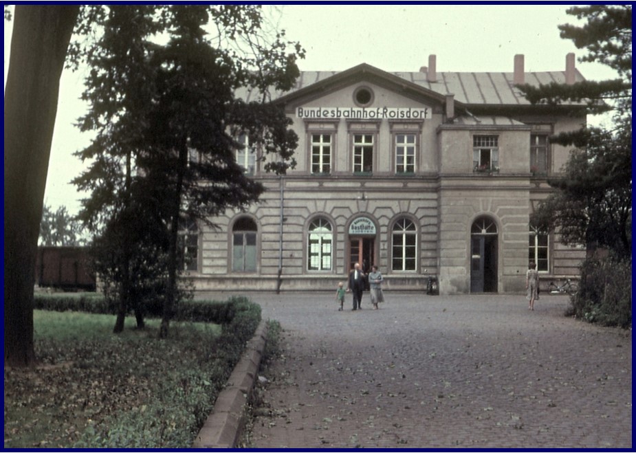 Auch bereits in den 1950er Jahren hatte der Roisdorfer Bahnhof seine besten Zeiten hinter sich. Der Zweite Weltkrieg hatte ihn arg mitgenommen, auf seinem Vorplatz befand sich weiterhin der Löschteich, den man angesichts des drohenden Fliegerbeschusses angelegt hatte. Aber immer noch ließ sich die repräsentative Architektur des mit einem parkartigen Vorplatz versehenen Kurbahnhofs aus der Mitte des 19. Jahrhunderts erahnen. Für die Gegenwart erschien er freilich als unpraktisch und überdimensioniert, so dass man nicht weiter in seine Erhaltung zu investieren bereit war. Sein Ende kam schließlich 1970, als man ihn kurzerhand abriss und durch ein bescheidenes, heute heruntergekommen wirkendes Bahnhäuschen ersetzte. Den Bahnhof und sein Umfeld erneut ebenso ansehnlich wie funktional zu gestalten und ihn damit wieder zu einem angemessenen Entrée für Roisdorf werden zu lassen, ist zur Zeit Gegenstand verschiedener Initiativen, denen man nur ein glückliches Händchen wünschen kann.