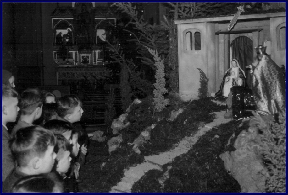 Bis heute alljährlich sehenswert: Die in diesem Kalender bereits mehrfach vorgestellte Advents- und Weihnachtskrippe der Roisdorfer Pfarrkirche St. Sebastian, die gewiss zu den künstlerisch herausragenden Krippen im neuen Sendungsraum Vorgebirge (Bornheim/ Alfter) gehört, dabei mit ihren beweglichen Figuren und den reichen Gestaltungsmöglichkeiten der einzelnen Szenen an Vielgestaltigkeit – bis hin zu der originellen Pfingstkrippe des Jahres 2020 – kaum übertroffen werden dürfte. In den Kriegsjahren auf Initiative von Pfarrer Matthias Ossenbrink von der Krippen-künstlerin Johanna Lamers-Vordermayer geschaffen, beeindruckte sie nicht nur, wie offensichtlich auf unserem Bild, die Roisdorfer Jugend, sondern auch weitere Besucher: So berichtet die Pfarrchronik, dass die auf Haus Wittgenstein residierende Prinzessin Armgard zur Lippe-Biesterfeld, die bis dahin nicht als sonderlich religiös galt, nach einem Besuch der Krippe gegenüber dem Pfarrer bekundete, den katholischen Glauben annehmen wollen, ein Entschluss, der von Königin Wilhelmina von Holland, der Schwiegermutter ihres Sohnes Bernhard, nur mit einem schmallippigen „Du scherzest!“ kommentiert werden sollte.
