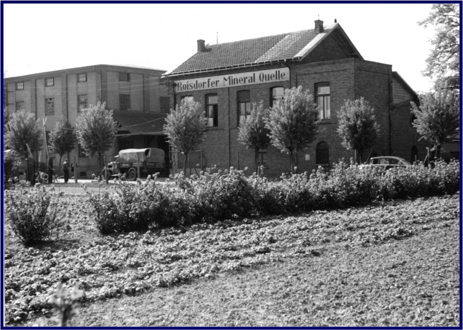 Einen sehr ländlichen Charakter hatte noch in der Nachkriegszeit die Umgebung des Roisdorfer Mineralbrunnens, wurde auf der ihm gegenüber liegenden Seite der Brunnenallee doch noch Landwirtschaft betrieben. Die Brunnenallee selbst war noch bis in die 1980er Jahre hinein, bevor man das Gelände mit dem Seniorenheim Maria-Hilf und Wohnsiedlungen bebaute, eine wirkliche Allee, so wie sie Ende des 18. Jahrhunderts vom Alfterer Grafen angelegt worden war. Das auf unserem Bild zu sehende alte, noch aus der Zeit des Brunnenpächters Custor im späten 19. Jahrhundert stammende, backsteinerne Eingangsgebäude wich in den 1950er Jahren einem zweckmäßigen modernen Verwaltungsgebäude und noch später wurden auch die Felder gegenüber mit den heutigen großen Lagerhallen bebaut, das dahinter liegende Gelände zu als offener Platz befestigt. Es blieb, auf dem Bild nicht zu sehen, der benachbarte Brunnenpark, der nach langer Zeit der Vernachlässigung im Jahre 2008 dankenswerterweise erneuert und mit dem geradezu ein Wahrzeichen Roisdorfs bildenden Pavillon bestückt wurde.