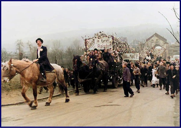 Ganz in Frauenhand war in Roisdorf in den 1950er Jahren noch der Weiberfastnachtszug, den das Damenkomitee „Germania“ kurz vor dem Zweiten Weltkrieg erstmals organsiert hatte – eine Idee, die weniger aus Beuel als vielmehr als Köln importiert worden war, wo die Frauen die Weiberfastnacht bei Besuchen auf dem Großmarkt kennengelernt hatten. Im Jahre 1953 bestand der ganze Zug lediglich aus zwei von Pferden gezogenen Wagen, mit Blüten geschmückt passend zum Motto „Frühling im Kurort Roisdorf“. Die Roisdorfer Kinder – nur wenige von ihnen irgendwie kostümiert – liefen nebenher und erhofften sich reichlichen Kamellensegen. Ansonsten erkennt man hier auf der Siegesstraße keine Zuschauer, ganz anders in späteren Zeiten, in denen der bis zu 40 Gruppen zählende Zug dort von Tausenden Jecken bejubelt wurde. Die Weiber hatten aber auf jeden Fall mächtig Spaß an ihrem Treiben, zu dem, wie ein Schild kundtut, Männer erst ab 19.11 Uhr eingelassen wurden, ganz ähnlich wie dies heute noch bzw. hoffentlich wieder in 2022 bei den „Bunten Nachmittagen“ der Kath. Frauengemeinschaft der Fall ist.