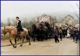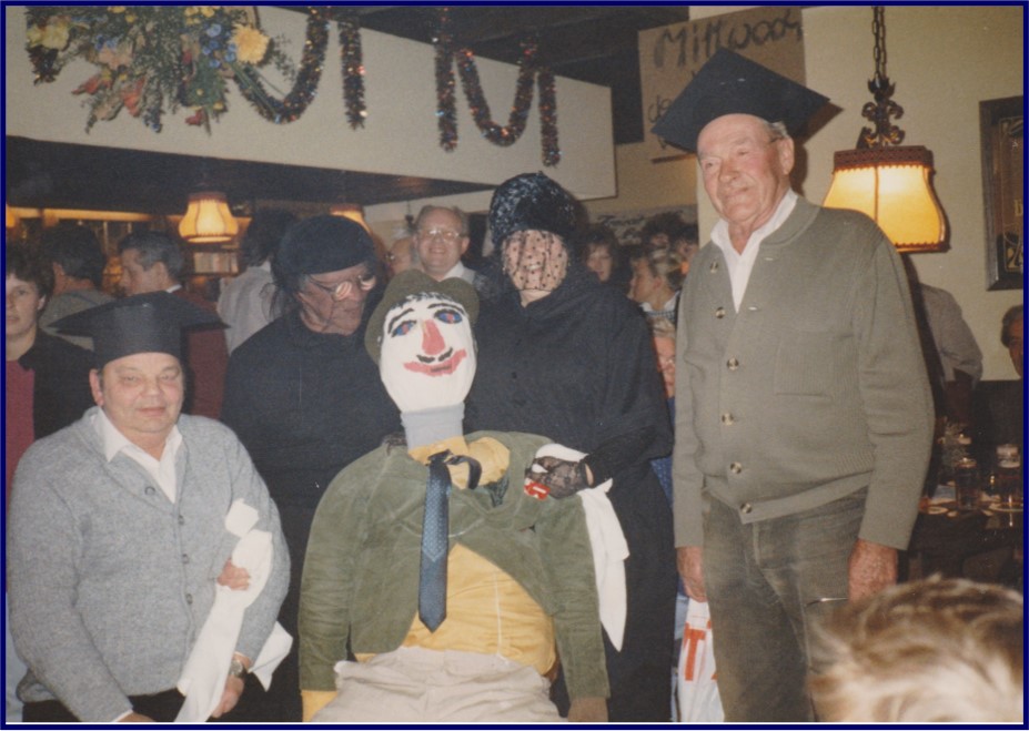 Dass der Paias, in anderen Orten Zacheies genannt, unverzichtbar zur rheinischen und nicht zuletzt auch zur Roisdorfer Kirmes gehört, dürfte den regelmäßigen Beziehern dieses Kalenders nicht unbekannt sein. Stets war dieser Brauch mit den Gastwirtschaften des Orts verbunden, wo der Kirmeskerl in die Mitte der feucht-fröhlich Feiernden genommen wurde. In den vergangenen Jahrzehnten waren es verschiedene Gruppen, die ihn jeweils zur Kirmes hervorholten. So traf man ihn in den 1970er Jahren in der Wirtschaft von „Fringse Änn“ in der Brunnenstraße an, wurde er in den 1980er Jahren von einer Gruppe um Marianne Fuhs in der Gaststätte „Zur Wolfsburg“, Ecke Brunnenstraße/ Lindenberg, gesichtet, was seine Fortsetzung dann in der Gaststätte „Alt-Roisdorf“ im Oberdorfer Weg fand, bevor die Tradition 1991 von den Heimatfreunden Roisdorf und schließlich vom Junggesellenverein „Echte Fründe“ weitergeführt wurde. Unser Bild zeigt die unvermeidliche Verurteilung am Ende der Kirmes durch den in der Nachbarschaft wohnenden Heinz Sickert, der den Paias übrigens über 10 Jahre hinweg jeweils selbst aus Latten, Stroh und alten Kleidern bastelte. Dabei – über das schreckliche Schicksal des Paias klagend – seine Frau Anna Sickert und Frau Sieberts (?), daneben als weiterer Richter Herr Peter Engels (Appelmann).