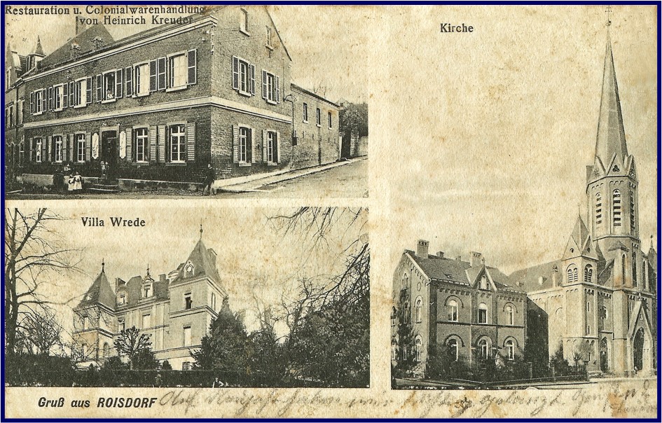 Die Zeit um die Wende vom 19. auf das 20. Jahrhundert war die Blütezeit der lithografischen, dann auch fotografischen Ansichtskarten, die man nicht nur in Roisdorf verkaufte, sondern auch in den anderen Orten des Vorgebirges, in die man von Bonn und Köln aus insbesondere zu Zeiten der Baumblüte reiste. Neben besonders sehenswerten Gebäuden im Ort – hier der prächtige Kirchturm mit dem schmucken neuen, leider später dem Verkehrsfluss geopferten Pastorat und das Haus Wrede im Siefenfeldchen – sind dabei stets auch die Gastwirtschaften abgebildet, die die Ansichtskarten in Auftrag gaben. Etwa sieben solcher Gastwirtschaften gab es in frühen 20. Jahrhundert im Dorf. So sehen wir hier die Restauration von Heinrich Kreuder, der auch eine Colonialwarenhandlung für die Lebensmittelversorgung der Nachbarschaft angeschlossen war. Beides wurde später von Johann Rech weitergeführt, die Wirtschaft von dessen Erben, der Familie Eich als „Zur Wolfsburg“. In jüngerer Zeit wechselten verschiedene Betreiber ab, so waren hier zuletzt italienische Restaurants „Fratelli“ und „Da Orazio“ angesiedelt, bevor in Sommer 2020 ein Restaurant mit italienischen und indischen Spezialitäten einzog, dem ein gutes und beständiges Wirken zu wünschen ist.