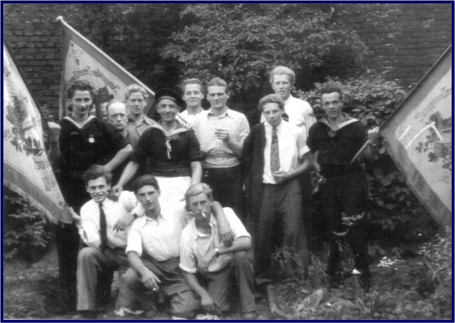 Wie Ortsvorstehers Wilhelm Rech in seiner Chronik beschrieb, fanden sich bereits im 19. Jahrhundert die heiratsfähigen Jünglinge Roisdorfs alljährlich zur sog. „Reih“ zusammen, um die Maiaktivitäten zu organisieren. Meist für den Ostermontag setzte man das „Mailehen“, also die Versteigerung der jungen Mädchen an. „Der Ansteicher (Ersteigerer) durfte dann das betreffende Mädchen im Laufe des Jahres zum Tanze führen, selbstverständlich mit Ihrer Einwilligung. Bekam der betreffende Jüngling einen Korb, dann brauchte er für den Spott nicht zu sorgen. Kam ihm aber ein anderer ins Gehege, dann setzte es in der Regel blutige Köpfe ab. Der Rest der Mädchen wurde zusammen ausgestellt. Wer diese dann ansteicherte (ersteigerte), hatte die Wahl und auch die Qual. Am ersten Mai wurde den Mädchen, wo sie wohnten, einen grünen Mai auf das Dach gesteckt. Und an einem Sonntage im Mai wurde das Maispiel (Tanzmusik) abgehalten“. Unser Bild zeigt den Junggesellenverein „Gemütlichkeit“, dessen Mitglieder fast nur im „Dörp“, also in der Brunnenstraße beheimatet waren, und mit Johann Cronenberg einen Altmeister im Fähndelschwenken in ihren Reihen hatte, der auch noch in späteren Zeiten seine Kunst ausübte, in denen es keinen Junggesellenverein im Dorf gab.