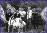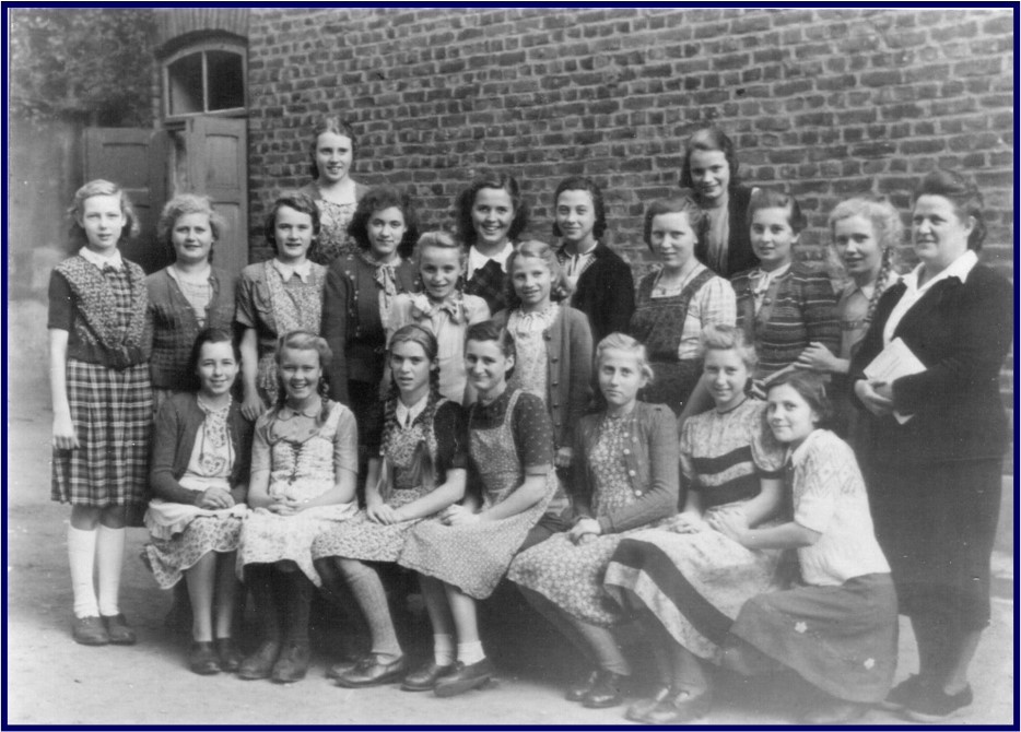 In der alten Volksschule in der Brunnenstraße, die bis 1962 betrieben wurde, waren die Schüler der oberen Klassen, also ab dem 5. Schuljahr, noch nach Geschlechtern getrennt, was gewiss einer sittsamen Erziehung der Jugend förderlich war. So posieren auf unserem Bild der Abschluss-klasse von ca. 1950 auf dem Schulhof ausschließlich Mädchen zusammen mit ihrer langjährigen Lehrerin Fräulein Kaufmann. Gewiss werden einige unter den abgebildeten Mädchen noch ihre Großmutter oder eine betagte Nachbarin erkennen: In der oberen Reihe v.l.n.r. Christel Wünsch, Anna Botz, Thea Tönnessen, Sylvia Hennes, Käthe Klein, Thea Dederich, Gertrud Grün, Marianne Zündorf, Gertrud Faßbender, Johanna Lammerich, Hilde Kentenich und Adele Schoß. In der unteren Reihe Marlene Botz, Anna Niederstein, Anna-Maria Prangenberg, Marianne Stemmler, Marianne Heuser, Maria Bell und Gerda Schäfer.