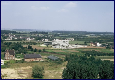 Bereits in den Nachkriegsjahren wurde deutlich: Die Verwaltung des Amts Bornheim, zu dem bereits in den 1930er Jahren die Gemeinden Bornheim, Hersel und Sechtem zusammengeschlossen worden waren, platzte aus allen Nähten. Auf vier verschiedene, alte Häuser aufgeteilt, war sie den durch die Bevölkerungsanstieg und die wirtschaftliche Entwicklung gestiegenen Anforderungen nicht mehr gewachsen: Ein Rathausneubau, so der Rat im Jahre 1953, musste her. Es sollte jedoch noch lange dauern, bis man sich nach heftigen Diskussionen als Standort auf das freie Gelände zwischen Roisdorf und Bornheim einigte und 1968 der erste Spatenstich zu dem neuen, vom renommierten Bonner Architekten Ernst van Dorp entworfenen Rathaus erfolgen konnte: Ein großzügiges Gebäude mit einem Verwaltungs- und einem Ratstrakt samt geräumigem Ratssaal, zwei kleineren Sitzungsräumen und einem Rathausrestaurant. Die offizielle Einweihung erfolgte am 28. Januar 1971. Das Rathaus des Amts Bornheim, das auf unserem Bild noch wie ein Fremdkörper in der Landschaft wirkt, bildete somit den Kern der intensiven baulichen Erschließung des heute kaum mehr wiederzuerkennenden Geländes. Inzwischen renoviert und modernisiert ist es gleichwohl für die Verwaltung der – seit 1981 – Stadt Bornheim wiederum zu klein, so dass nach Erweiterungsmöglichkeiten gesucht werden muss.