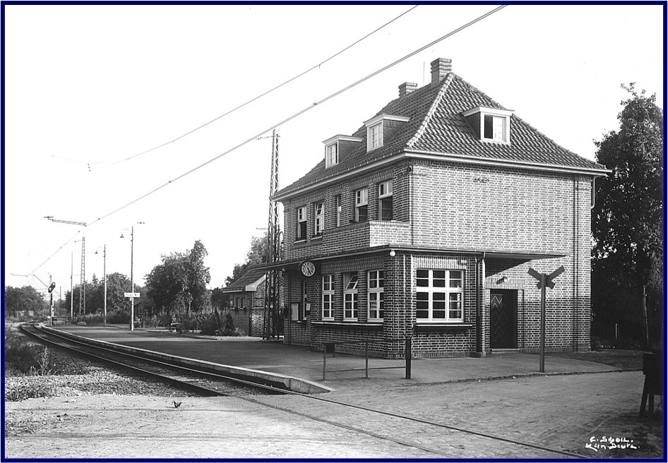 Auch wenn der Abschied vom schnaufenden „Feurigen Elias“ am letzten Junitag 1929 mit Wehmut vollzogen wurde: Man war stolz darauf, dass am Folgetag nach jahrelanger Verspätung endlich die Vorgebirgsbahn auf einem ersten Teilstück vom Bonner Rheinuferbahnhof bis nach Waldorf den normalspurigen elektrischen Personalverkehr aufnehmen konnte. Man hatte die wenigen Jahre des wirtschaftlichen Aufschwungs zuvor nutzen können, um eine neue, auf Zweispurigkeit angelegte Strecke am Vorgebirge aufzubauen, die zwischen Bornheim und Roisdorf die Auf-schüttung eines Bahndamms mit Überführung des Siefenfeldchens und Trockenlegung des „Alten Weihers“ sowie den Bau eines Unterwerks erforderte, das den Strom vom E-Werk Berggeist bezog. Und natürlich war auch am neuen Haltepunkt am Übergang in der Siegesstraße ein stattliches Bahnhofsgebäude geschaffen worden, in dessen Erdgeschoss sich neben dem Raum für den Schrankenwärter und dem Fahrkarten-schalter ein ringsum mit Holzbänken ausgestatteter Wartesaal befand, ein Toilettenhäuschen gab es außerhalb. Heute hat das Gebäude leider seine Funktion verloren. Nach einigen Versuchen, hier eine Gastronomie einzurichten, herrscht öder Leerstand. Hoffentlich findet sich bald eine sinnvolle Nutzung, und auch eine stilgerechte Renovierung des immer wieder aus-geflickten Mauerwerks des gewiss schützenswerten Gebäudes wäre wünschenswert.