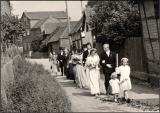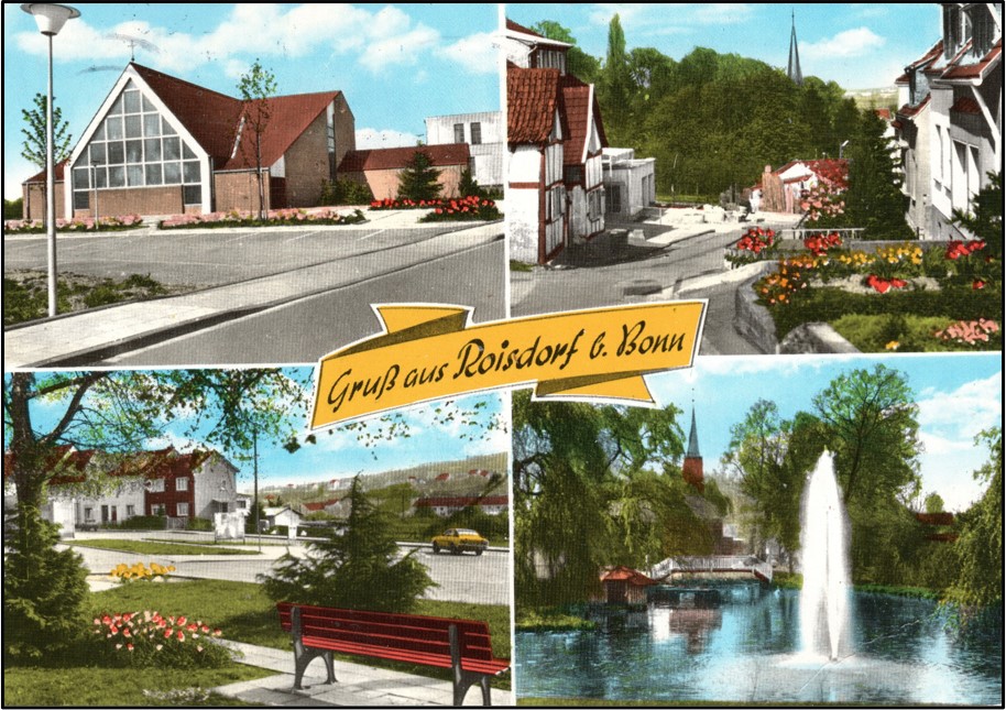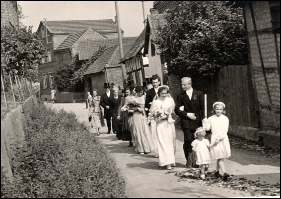Ein Brautzug – ein von blumenstreuenden Kindern geführter feierlicher Zug der Brautleute, der Eltern, Verwandten und Freunde vom Elternhaus der Braut zur Kirche oder von der Kirche zurück dorthin – dies war bis zum Beginn der 1970er Jahre eine liebe Tradition auch in Roisdorf. Hier sehen wir die Brautleute Käthi Thiesen und Richard Binicki im Jahre 1950 nahe des Elternhauses der Braut, und zwar in der „Baachjass“, der „Bachgasse“, der Straße zwischen Oberdorfer Weg und Schussgasse, die man später, als Bornheim Stadt wurde, aus unerfindlichen Gründen in „Berliner Straße“ umbenannte. Nichts gegen Berlin, aber doch wohl eine höchst unpassende Idee. Man sieht, dass die Bachgasse damals noch fast ganz mit den für das Vorgebirge typischen kleinen Fachwerkhäusern bzw. -gehöften bestanden waren, von denen sich nur wenige erhalten haben. Auf unserem Bild zu erkennen, von rechts nach links, „Thiesens Schüer“, die Häuser Roggendorf, Scheben, Wünsch und Düx. Auf der heute bebauten Bergseite der Bachgasse stützte eine lange Betonmauer das Gelände der Villa von „Botze Pitter“ ab.