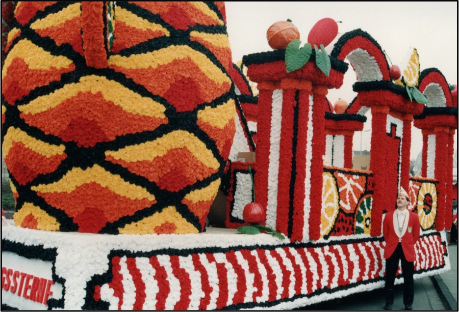 Zu recht mit Stolz blickt der Günther Schaefer auf den von seiner KG Vorgebirgssternen wiederum ganz in Eigenarbeit erstellten, diesmal einen exotischen Früchtecocktail darstellenden Prunkwagen. Jedes Jahr beteiligt sich die 1974 gegründete Tanzgruppe am Roisdorfer Weiberfast-nachtszug, in den 1980er und 1990er Jahren eben mit solchen pracht-vollen, von den Herren des Vereins gebauten und dann mit von den Damen in wochenlanger Handarbeit gefertigten Papierröschen geschmückten Wagen. Damit stand man in Konkurrenz zu den Prunk-wagen anderer Roisdorfer Vereine, wie dem TuS Roisdorf, den „Nixen von der Quelle“, den St. Sebastianus-Schützen etc., und mit Spannung erwartete man, bei der Karnevalsveranstaltung im Zelt an Kirmessamstag den ersten Preis der Wagenprämierung zu erhalten. Der jeweilige, nicht weniger aufwändige vor Ort gebaute Prinzessinnenwagen lief außer Konkurrenz. Als die dem Wagenbau dienenden Hallen, nicht zuletzt die des Centralmarkts, nicht mehr zur Verfügung standen, schrumpften allmählich auch die Wagen. Heute sieht man leider fast nur noch andernorts gemietete Karnevalswagen im Roisdorfer Weiberfastnachtszug.