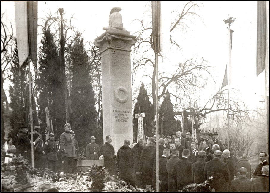 Vor genau 100 Jahren, am 11. Januar 2025, versammelten sich am Roisdorfer Lindenberg unter großer Anteilnahme der Bevölkerung Vertreter von Lokalpolitik, Reservistenverbänden und Vereinen wie den St. Sebastianus-Schützen zur Einweihung des „Krieger-Denkmals“. Der damalige Roisdorfer Pfarrer Ignaz Goertz, in der Mitte der Gruppe zu erkennen, segnete das Denkmal ein. Dort, wo ehemals die Roisdorfer Gerichtslinde gestanden haben soll, hatte man einen von einem antiken Kriegerhelm bekrönten massiven Pfeiler als Mahnmal für die auf einer Bronzeplatte verzeichneten Soldaten errichtet, die im Ersten Weltkrieg zwischen 1914 und 1918 gefallen waren. Insgesamt waren es 286 Roisdorfer Männer gewesen, die sich an dem unsinnigen Krieg gegen den französischen Erbfeind hatten beteiligen müssen. Von ihnen verloren 54 ihr junges Leben, etliche waren von den Folgen der Verwundungen noch lange gezeichnet. Um sie alle zu würdigen, benannte man die dem Mahnmal benachbarte Straße ins Oberdorf von „Lehmdahl“ in „Ehrental“ um.