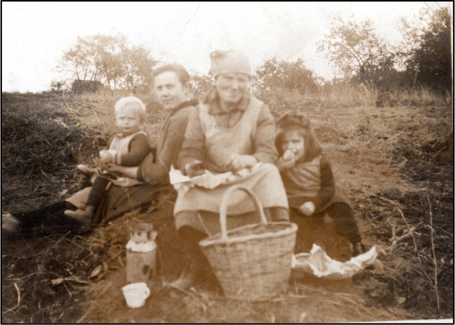 Die harte Arbeit auf den Feldern des Roisdorfer Oberdorfs, sie war einst durchaus auch Sache der Frauen. Und auch die Kinder waren selbstverständlich dabei. Auf unserem Bild erkennt man Elisabeth Fendel, geb. Weber, mit ihrem kleinen Sohn Heinrich sowie Annchen Thiesen, geb. Kuhl, mit ihrer Tochter Maria, wie sie bei der Feldarbeit eine Rast einlegen. „Botterramme“ und Kaffee in der „Tööt“, der Blechkanne, hatte man im Korb mitgenommen. Eine idyllische ländliche Szene, wie sie in früheren Jahrzehnten gewiss alltäglich war, wie man sie heute aber gar nicht mehr kennt.
