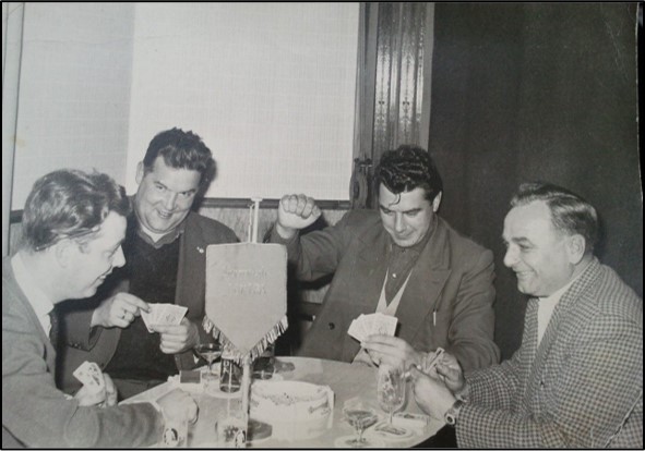 Skat gibt es überall, „Sibbeschröm“ aber nur im Rheinland, zwischen Niederrhein, Oberbergischem und Eifel. Das Spiel, für das man die üblichen Skatkarten verwendet und dessen Name sich als „Sieben Striche“ übersetzen lässt, ist leicht zu erlernen und hat einen großen Unterhaltungswert. So kann man es z.B. in der Stammtischrunde in der Wirtschaft ungezwungen spielen und sich gleichzeitig über alles Mögliche fröhlich auslassen. Es gibt bzw. gab sogar eigene Sibbeschröm-Clubs in der Region und Turniere im dörflichen Rahmen. Mit dem weitgehenden Verschwinden der Gastwirtschaften nicht nur in Roisdorf ist jedoch auch der „Sibbeschröm“, dieses rheinische Kulturgut, vom Aussterben bedroht. Hier sehen wir Gastwirt Addi Hamacher mit seinen gut gelaunten Freunden Hubert Schlösser, Heinz Fassbender und Jupp Schmitz beim Sibbeschröm am „Stammtisch Contra“ in seiner – inzwischen leider geschlossenen – „Gemütlichen Ecke“.