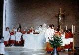 Am 28. September 1975, also vor genau 50 Jahren, war es endlich soweit: Die neuerbaute, bereits seit fast zwei Jahren in gottesdienstlichem Gebrauch befindliche Pfarrkirche St. Sebastian Roisdorf konnte geweiht werden. Man hatte hierfür bewusst den vierten Sonntag im September, den traditionellen Roisdorfer Kirmessonntag gewählt. Dieser Termin hatte mit der Weihe der alten, 1969 aufgegebenen und noch immer in verfallendem Zustand bestehenden Pfarrkirche nichts zu tun gehabt. Er war seinerzeit lediglich aus dem Grunde gewählt worden war, dass es eine Woche nach der Großkirmes der Alfterer Pfarrei war, der Roisdorf bis 1891 angehört hatte. Die feierliche Weihe der noch provisorisch eingerichteten Kirche nahm der Kölner Weihbischof Hubert Luthe vor. Man sieht ihn hier, wie er die Reliquien des Pfarrpatrons St. Sebastian vor deren Einmauerung in den neuen Altar segnet. Heute gibt es leider so gut wie keine Weihen neuer Kirchen im Erzbistum Köln mehr. Man kann froh sein, wenn die in den Jahrzehnten nach dem Zweiten Weltkrieg neuerbauten Pfarrkirchen weiter bestehen bleiben.
