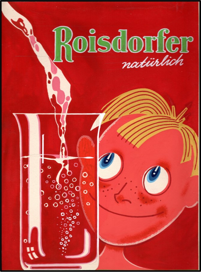 Auch nach der Zeit des in technischer und kommerzieller Hinsicht kreativen Pächters Wilhelm Custor hatten im 20. Jahrhundert die Geschäfte des Roisdorfer Mineralbrunnens weiter floriert, doch galt es in der Nachkriegszeit, sich neuen Anforderungen zu stellen. Hierzu gehörte es in den frühen 1950er Jahren, die Werbung für die Produkte zeitgemäß zu gestalten. Man bediente sich hierbei geschickter Grafiker, welche moderne und oft witzig gestaltete Entwürfe für Plakate und andere Werbematerialien erstellten. Unter anderem lieferte solche der bedeutende Maler Hann Trier (1915-1999), der seit 1946 Wohnung und Atelier in der Burg Bornheim hatte und zu den Begründern der Alfterer Künstlergruppe „Donnerstag-Gesellschaft“ zählte. Dass der hier abgebildete, handgemalte Entwurf für ein Webeplakat, der mit einer Reihe von weiteren, im ähnlichen Stil gestalteten erhalten blieb, von seiner Hand stammt, ist durchaus möglich, wenn auch, da unsigniert, leider nicht gesichert.