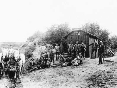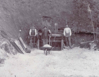 Rech dürfte hier die Sandkauhlen vor Augen gehabt haben, die sich in der Nähe des heutigen Schützenplatzes an der Essener Straße befanden. Darüber hinaus gab es, unweit der Roisdorfer Gemarkung, aber schon auf den Höhen über Botzdorf gelegen, die mächtige „Grube Maria“. Die untenstehende Fotografie, wohl aus den 1880er oder 90er Jahren, gewährt den Blick in diese Grube und zeigt Arbeiter, die dort in Handarbeit, also noch ohne den Einsatz von Maschinen, den unter mächtigen Schichten von Erdreich befindlichen weißen Sand fördern und abtransportieren. Auf Foto rechts sieht man die Arbeiter vor einer Holzhütte am Rande der Grube – samt einem die staubige Arbeit erträglich machenden Schnapseinschenker.
